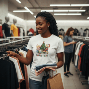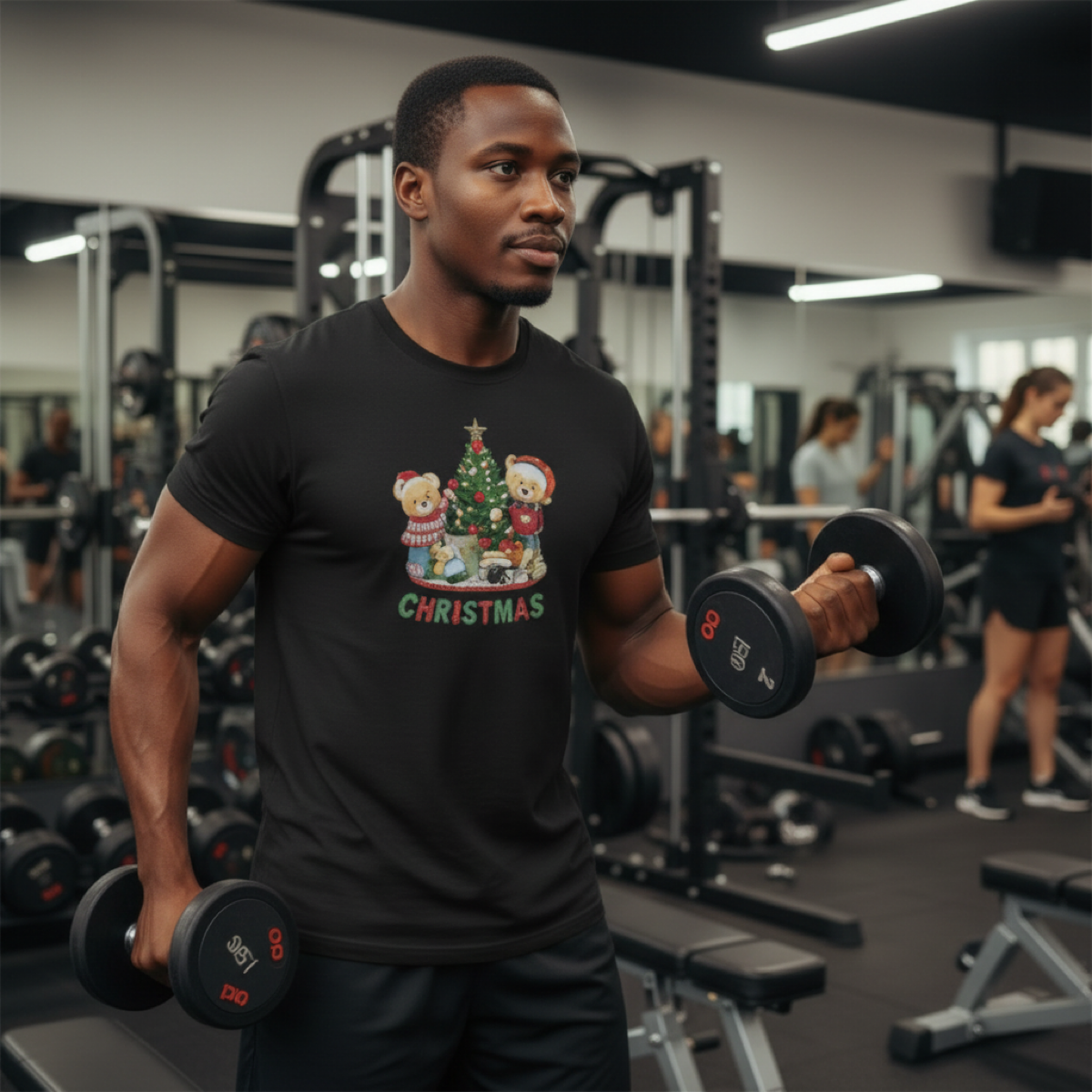 O ursinho festivo, a árvore de Natal iluminada e o lettering “CHRISTMAS” criam uma peça harmoniosa, perfeita para quem quer vestir o Natal de forma elegante e confortável.